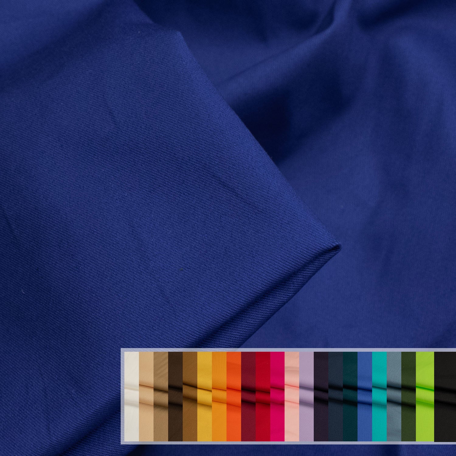 Cotton Drill is a premium quality drill fabric, available in a vibrant range of colors. 200-250GSM Cotton Drill is a heavy-weight, durable fabric ideal for making structured garments like trousers, shorts, skirts, chino pants, aprons, and dresses and it is also a perfect fit for upholstery, outdoor furniture, and craft projects. Our Cotton Drill is 150cm wide meaning you require less than the standard 112cm wide Cotton Drill.