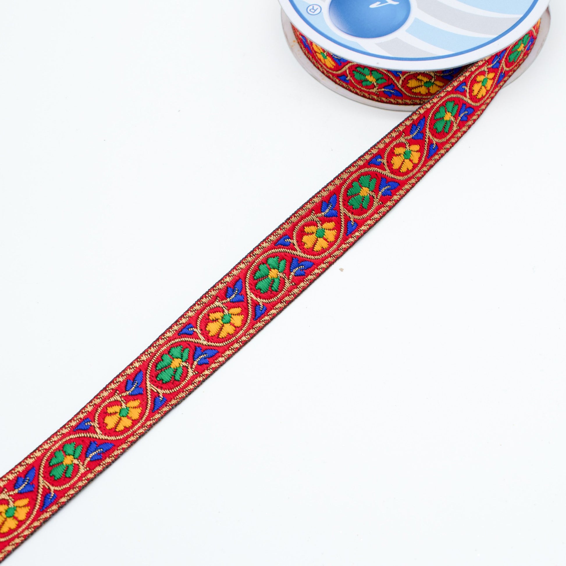 A large selection of embroidered/woven jacquard ribbons, Available in different sizes, this collection includes patterns such as geometric, florals, vines, Greek key designs, and ethnic motifs.