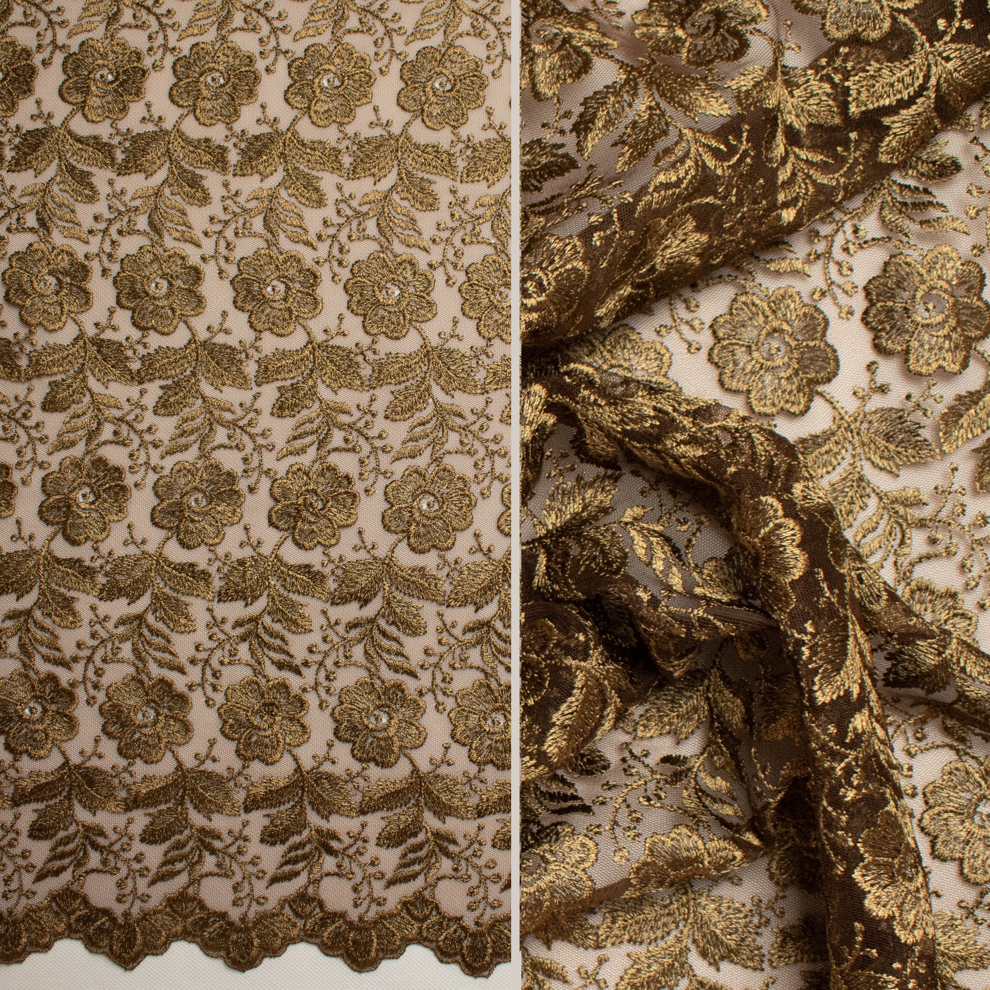A densely Embroidered Lace on a tulle net backing with double scalloped edges. The embroidery comes in two sizes - A larger floral design and a smaller all over floral pattern. With over fifty colours to choose from, Our Embroidered Lace is the perfect choice for bridal wear, cocktail wear, evening wear as well as mother of the bride. Use a matching or contrasting colour from any of our beautiful Crepe Back Satins as an underlining to finish your garment.