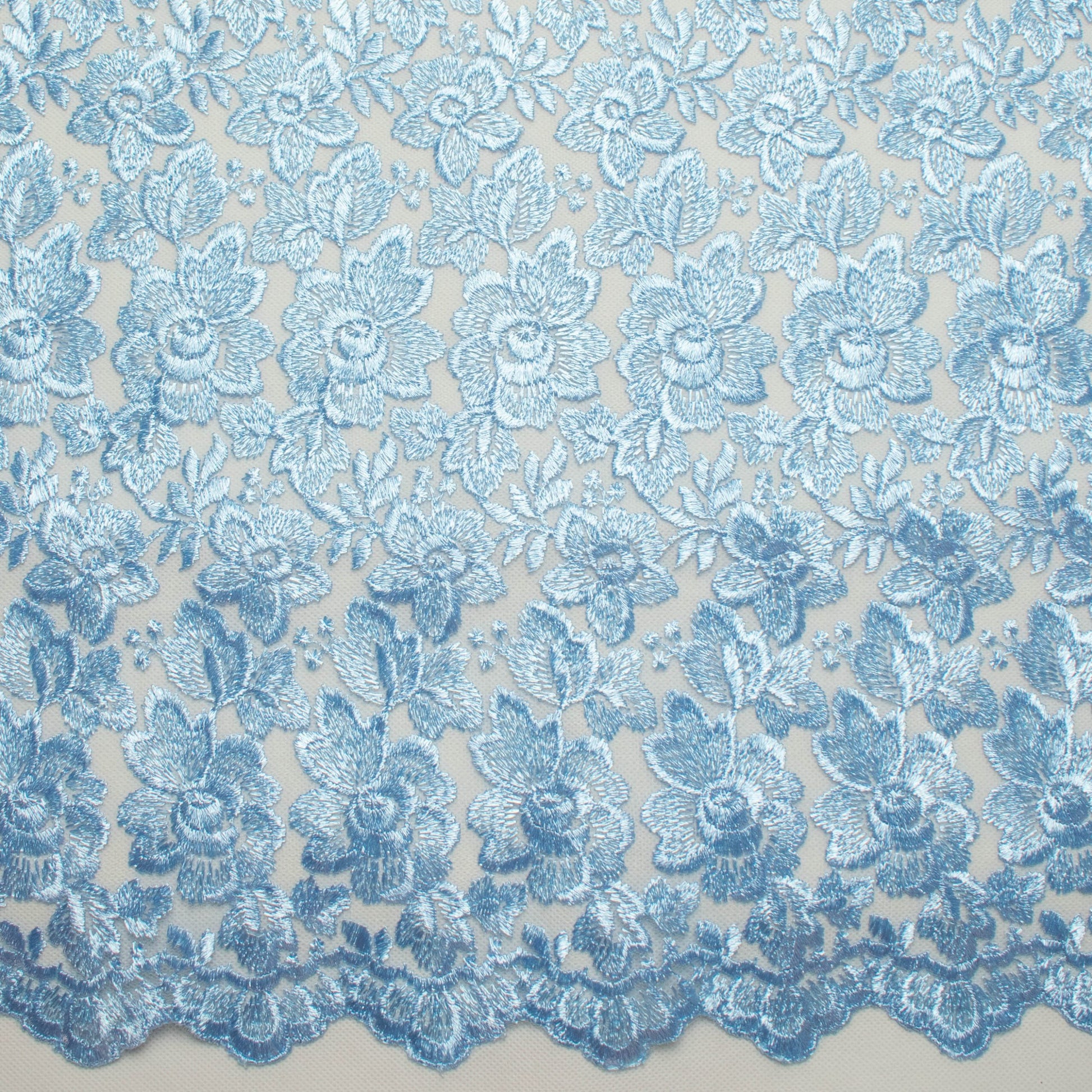 A densely Embroidered Lace on a tulle net backing with double scalloped edges. The embroidery comes in two sizes - A larger floral design and a smaller all over floral pattern. With over fifty colours to choose from, Our Embroidered Lace is the perfect choice for bridal wear, cocktail wear, evening wear as well as mother of the bride. Use a matching or contrasting colour from any of our beautiful Crepe Back Satins as an underlining to finish your garment.
