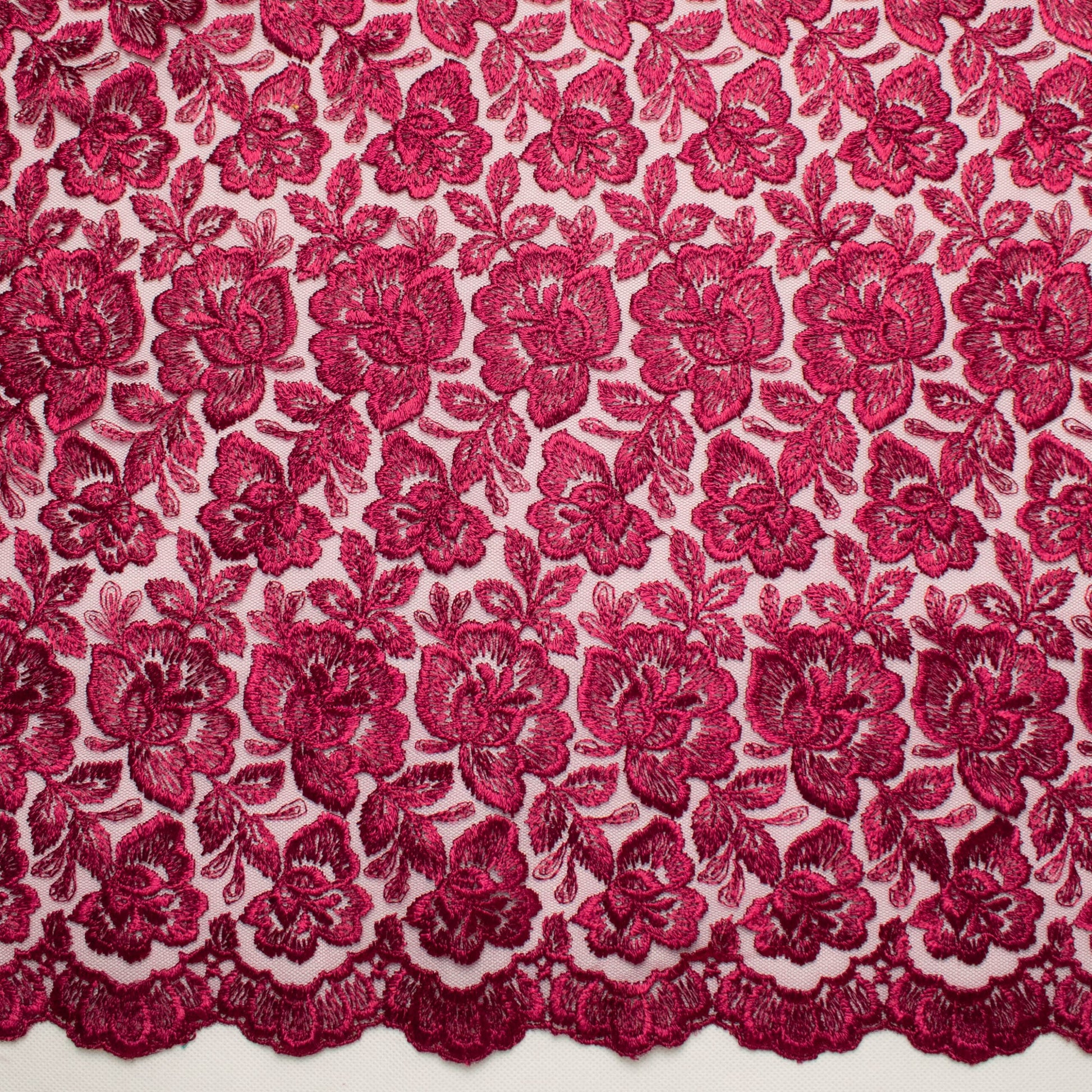 A densely Embroidered Lace on a tulle net backing with double scalloped edges. The embroidery comes in two sizes - A larger floral design and a smaller all over floral pattern. With over fifty colours to choose from, Our Embroidered Lace is the perfect choice for bridal wear, cocktail wear, evening wear as well as mother of the bride. Use a matching or contrasting colour from any of our beautiful Crepe Back Satins as an underlining to finish your garment.