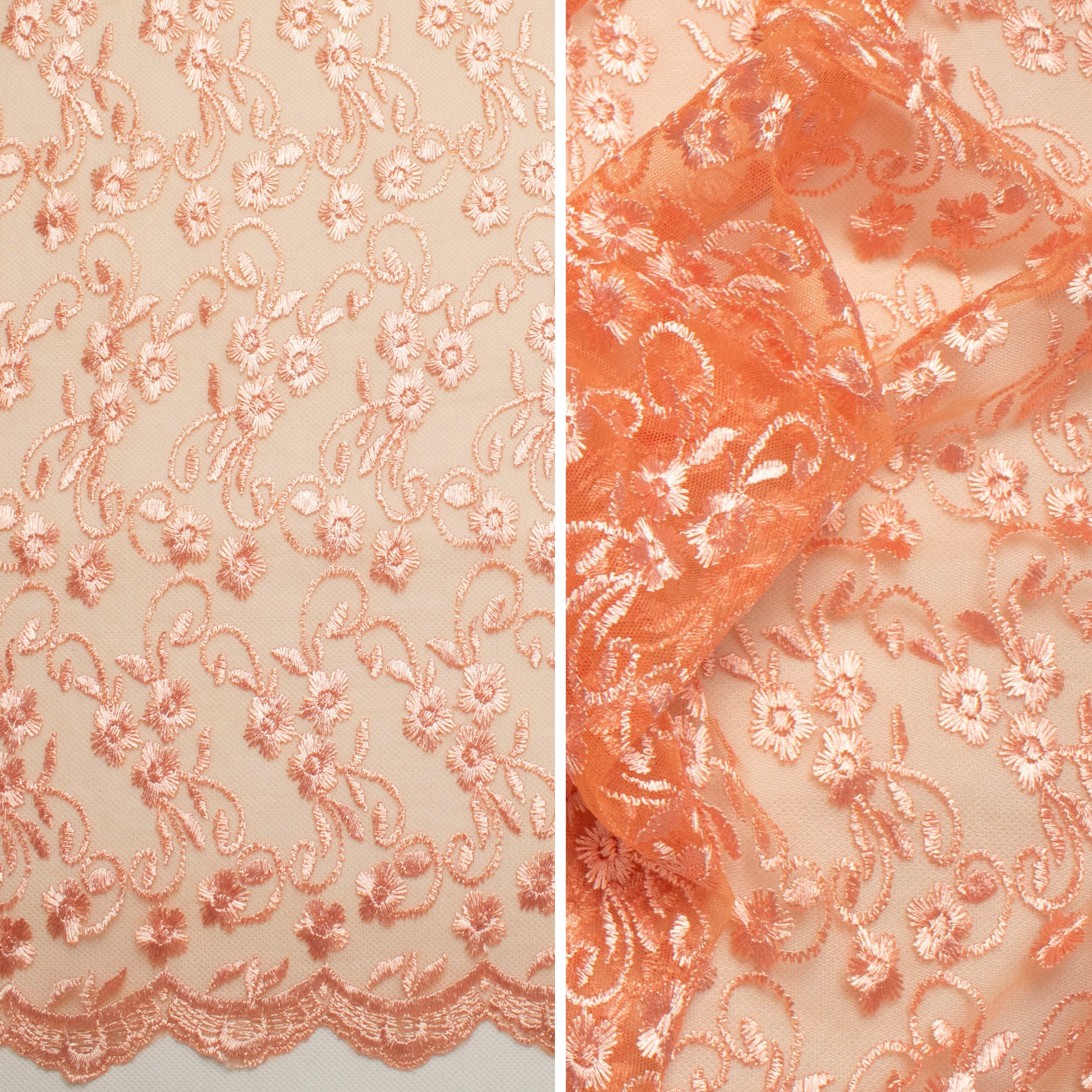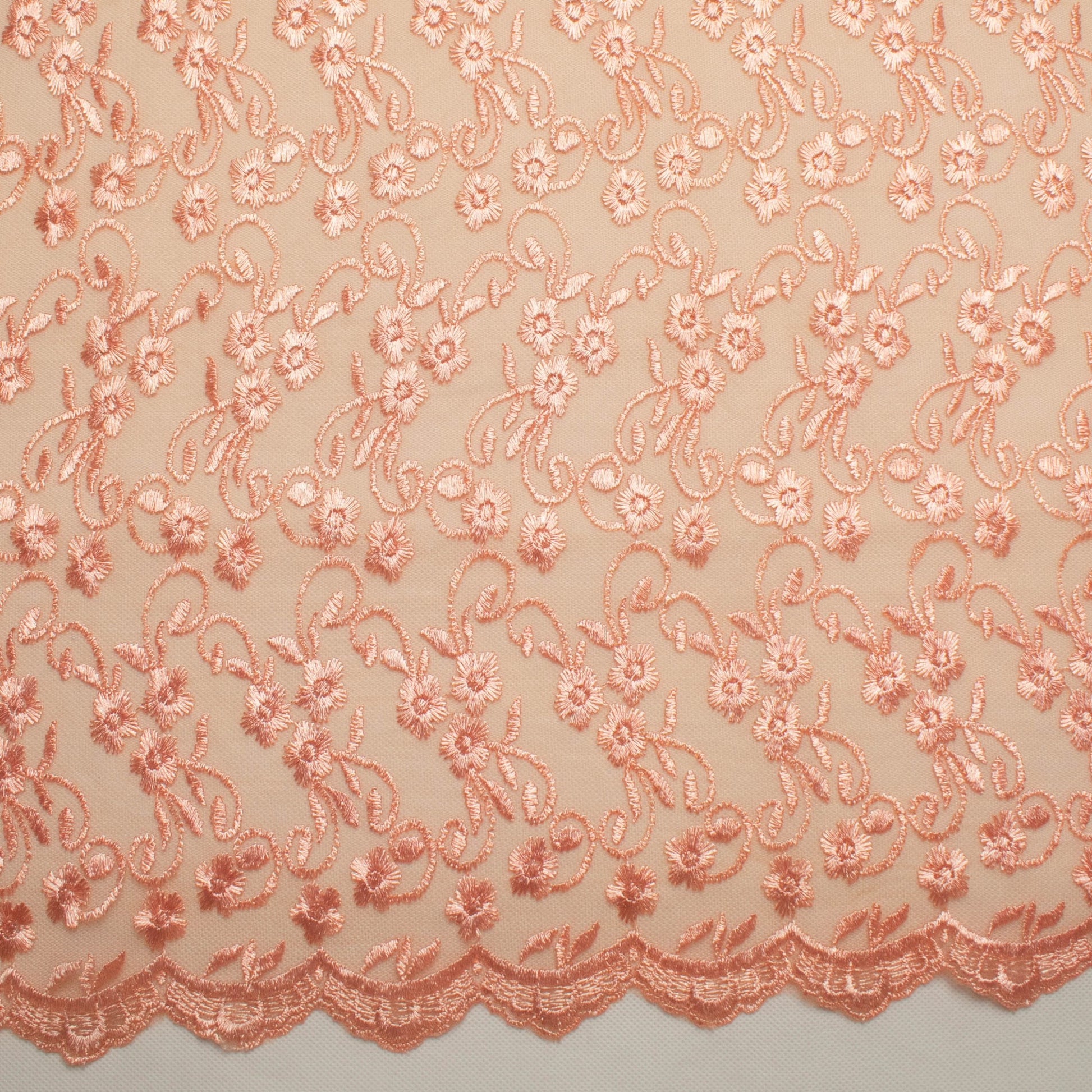 A densely Embroidered Lace on a tulle net backing with double scalloped edges. The embroidery comes in two sizes - A larger floral design and a smaller all over floral pattern. With over fifty colours to choose from, Our Embroidered Lace is the perfect choice for bridal wear, cocktail wear, evening wear as well as mother of the bride. Use a matching or contrasting colour from any of our beautiful Crepe Back Satins as an underlining to finish your garment.