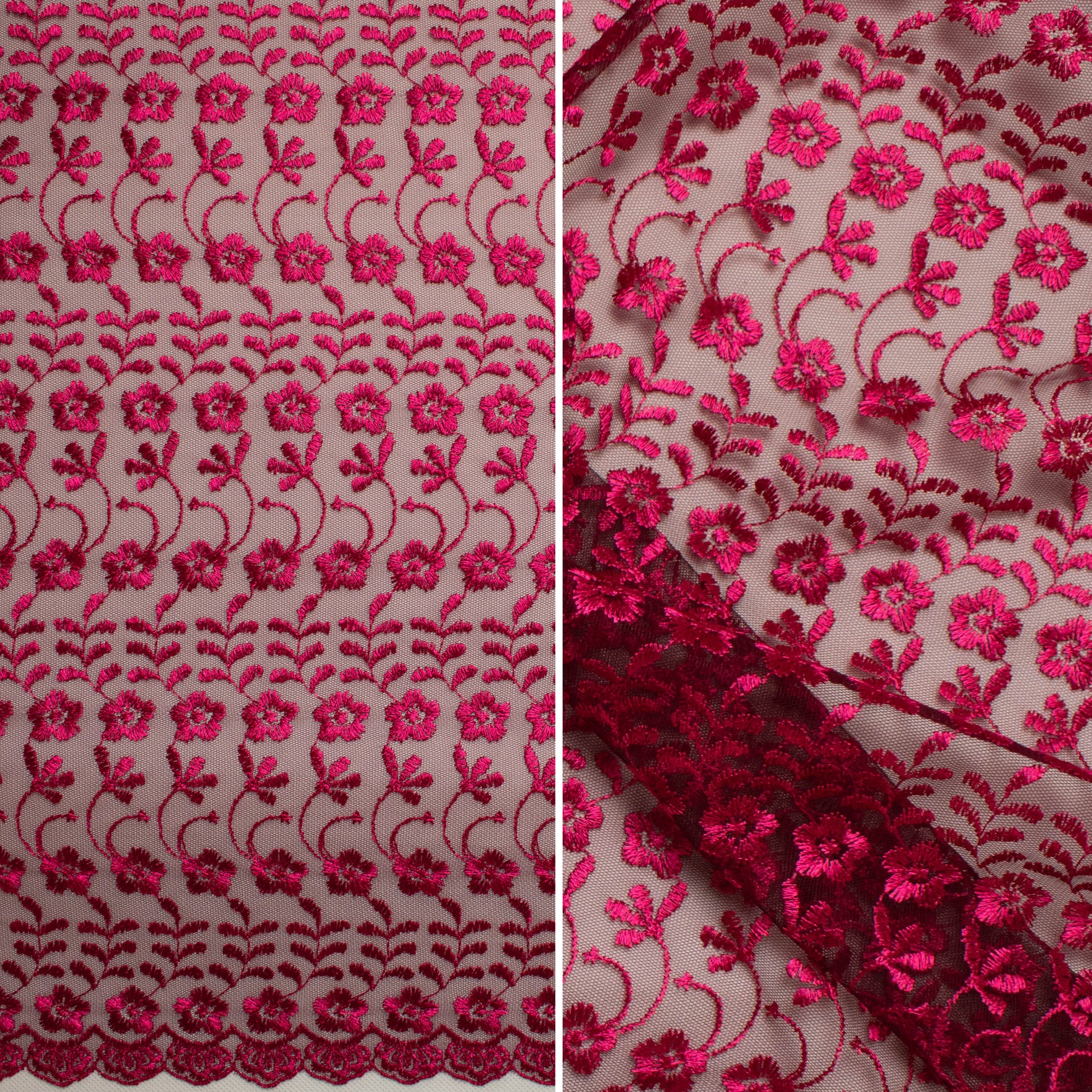 A densely Embroidered Lace on a tulle net backing with double scalloped edges. The embroidery comes in two sizes - A larger floral design and a smaller all over floral pattern. With over fifty colours to choose from, Our Embroidered Lace is the perfect choice for bridal wear, cocktail wear, evening wear as well as mother of the bride. Use a matching or contrasting colour from any of our beautiful Crepe Back Satins as an underlining to finish your garment.
