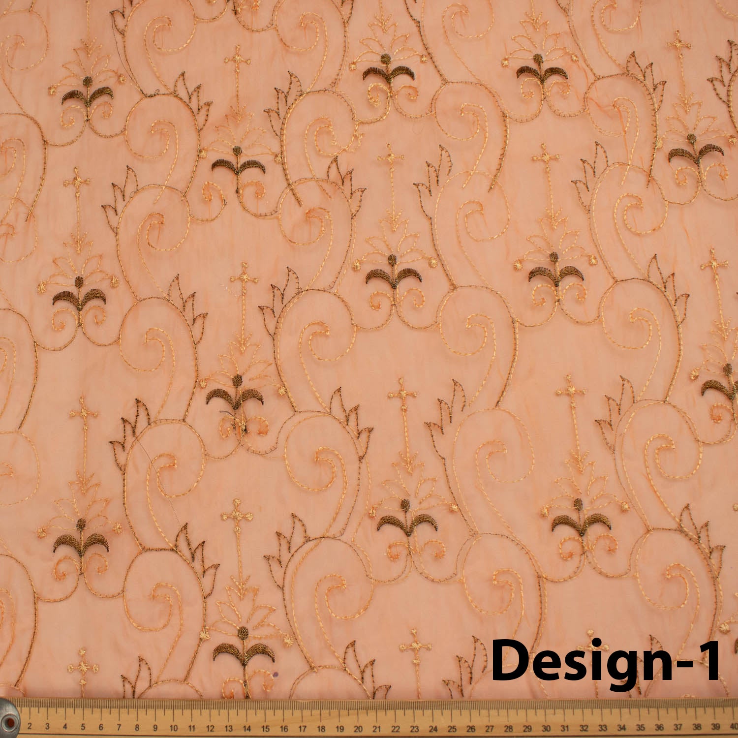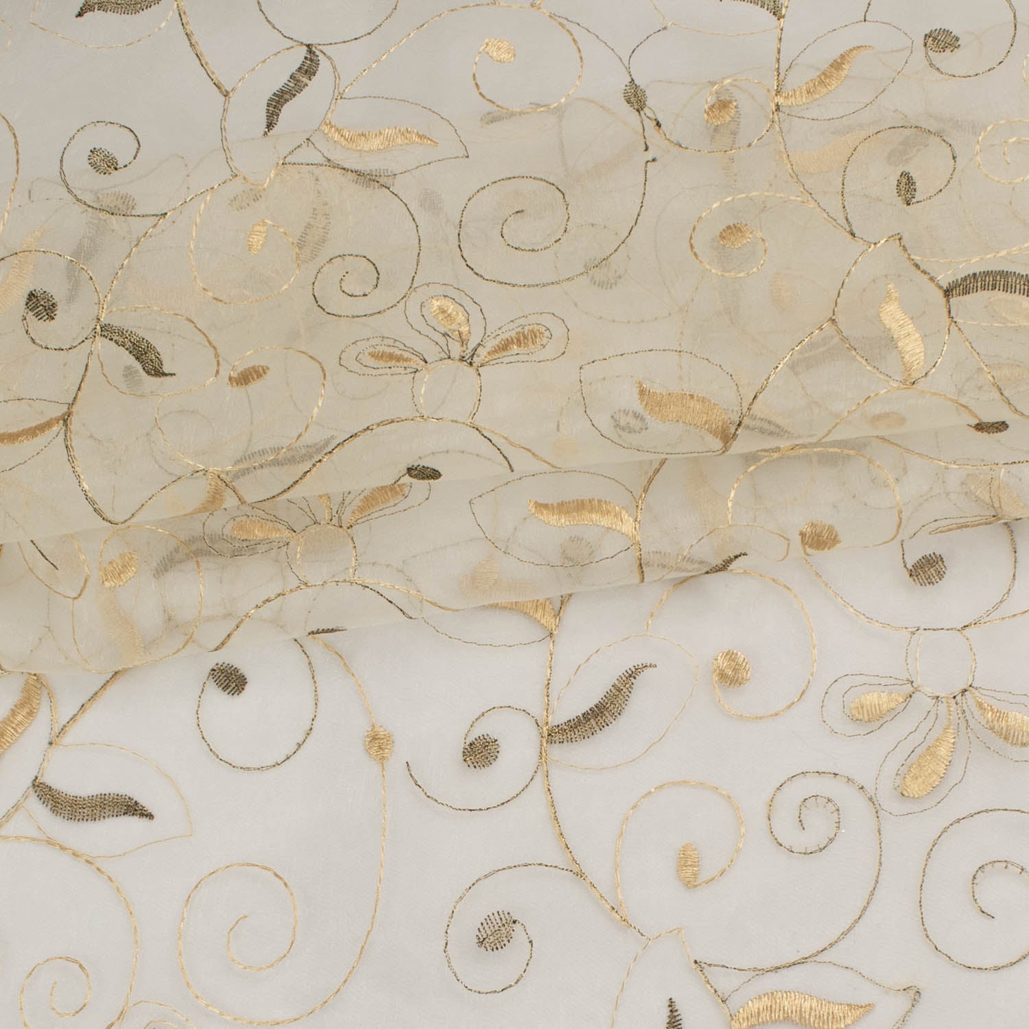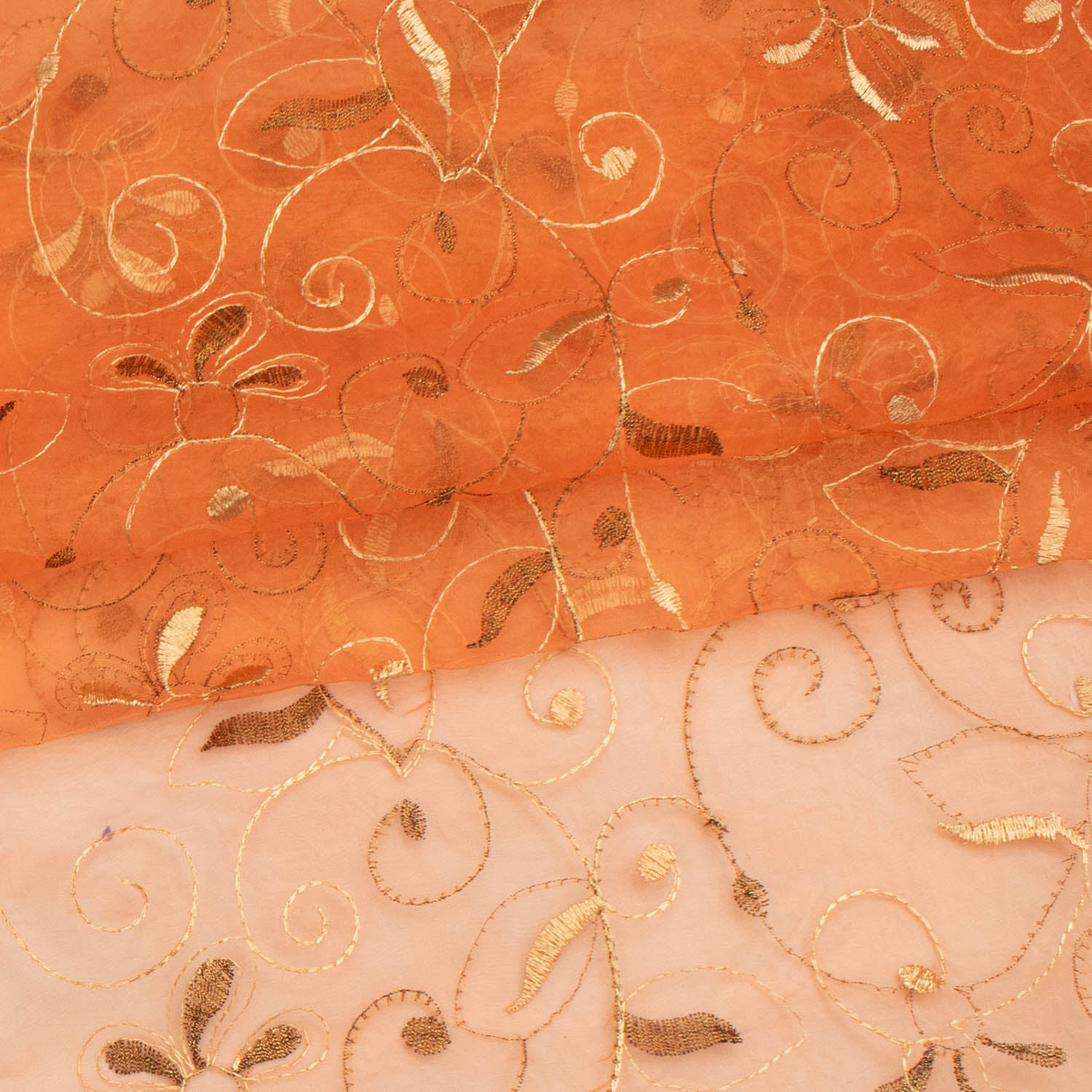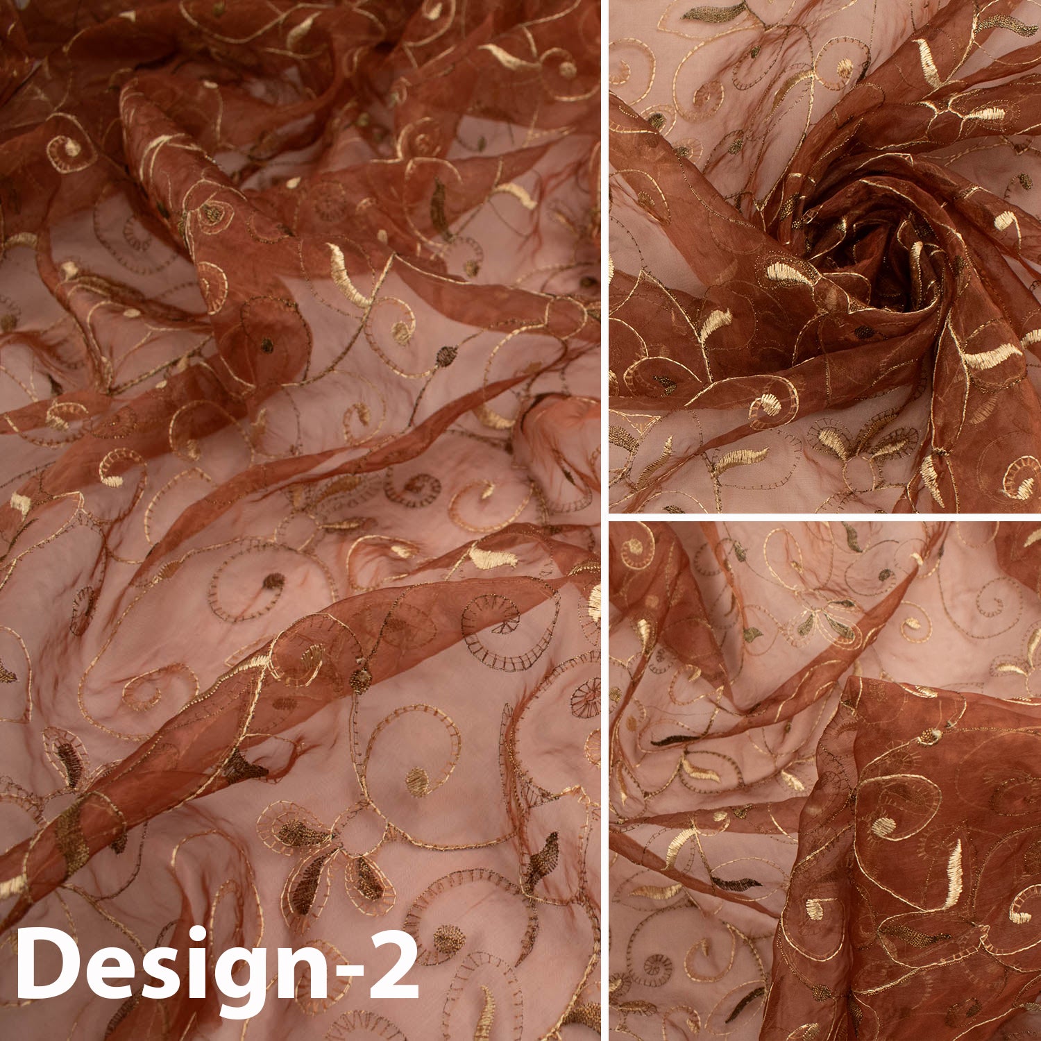 Embroidered Organza features sheer elegance with lightweight and transparent fabric, intricate festive embroidery in holiday colors, and a crisp, slightly stiff texture for structured designs.