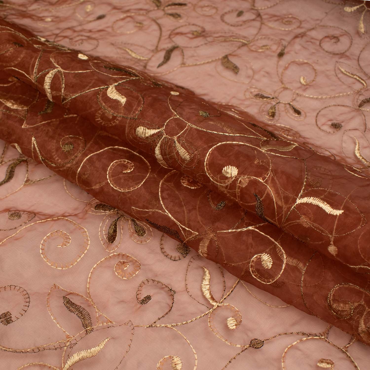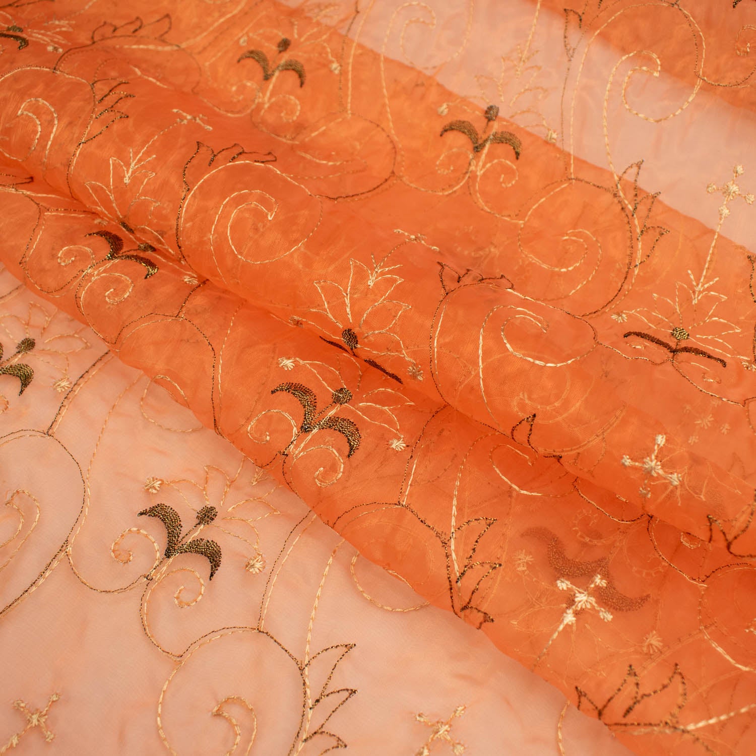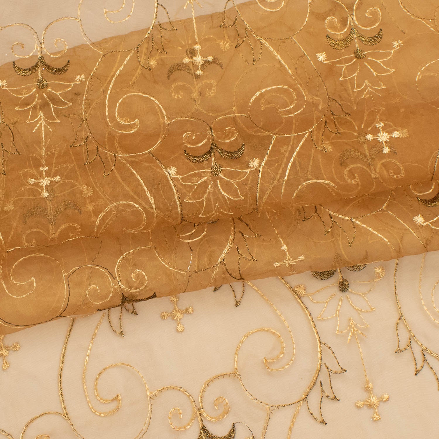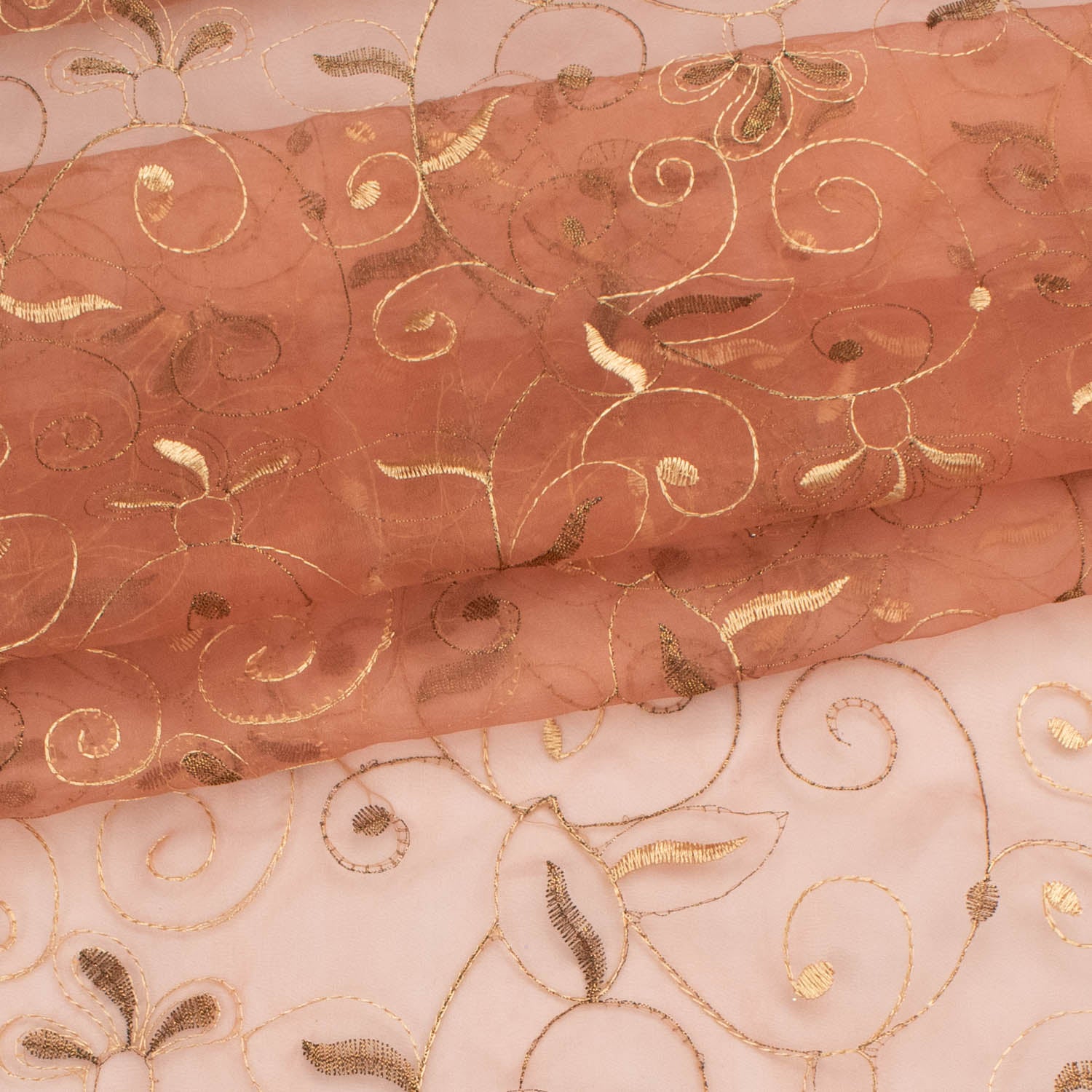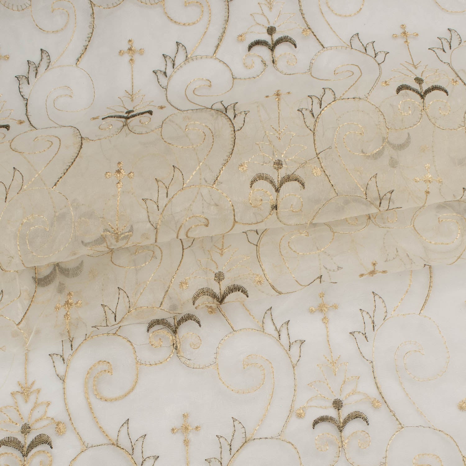 Embroidered Organza features sheer elegance with lightweight and transparent fabric, intricate festive embroidery in holiday colors, and a crisp, slightly stiff texture for structured designs.