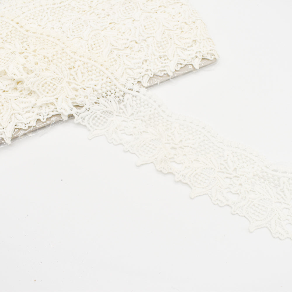 A dainty guipure lace with a decorative edging to trim your sewing projects, such as shawls, dresses and blouses.
