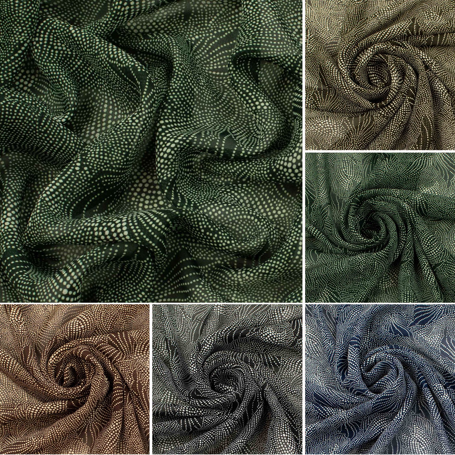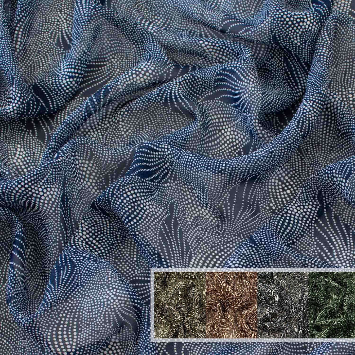 Our Floral Dot-Art Printed Chiffon is a lightweight and breathable fabric with a Dot-art leave print, available in a five colors. Perfect for creating airy summer pieces, from blouses, dresses, shirts to scarves, this fabric combines comfort and style in every thread.