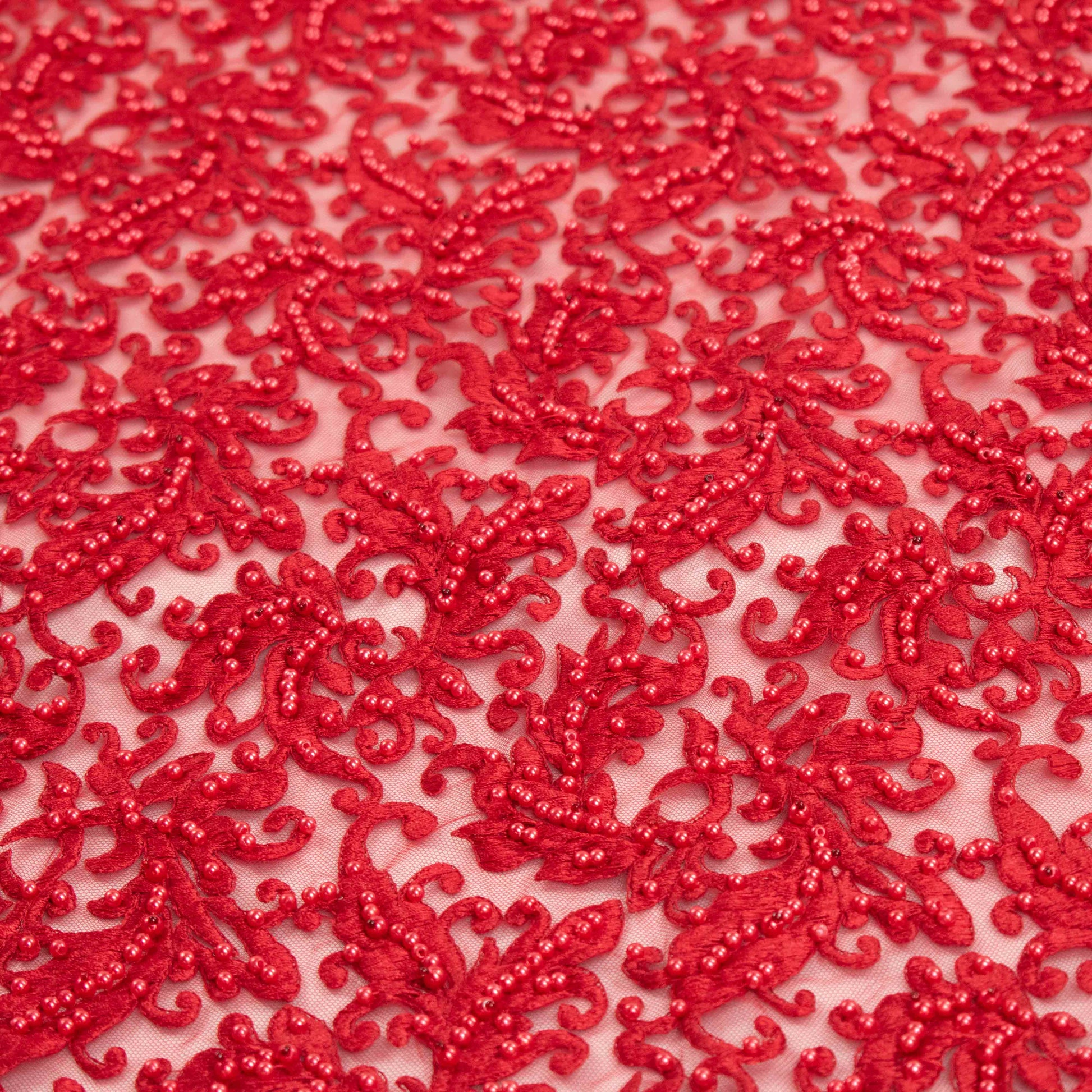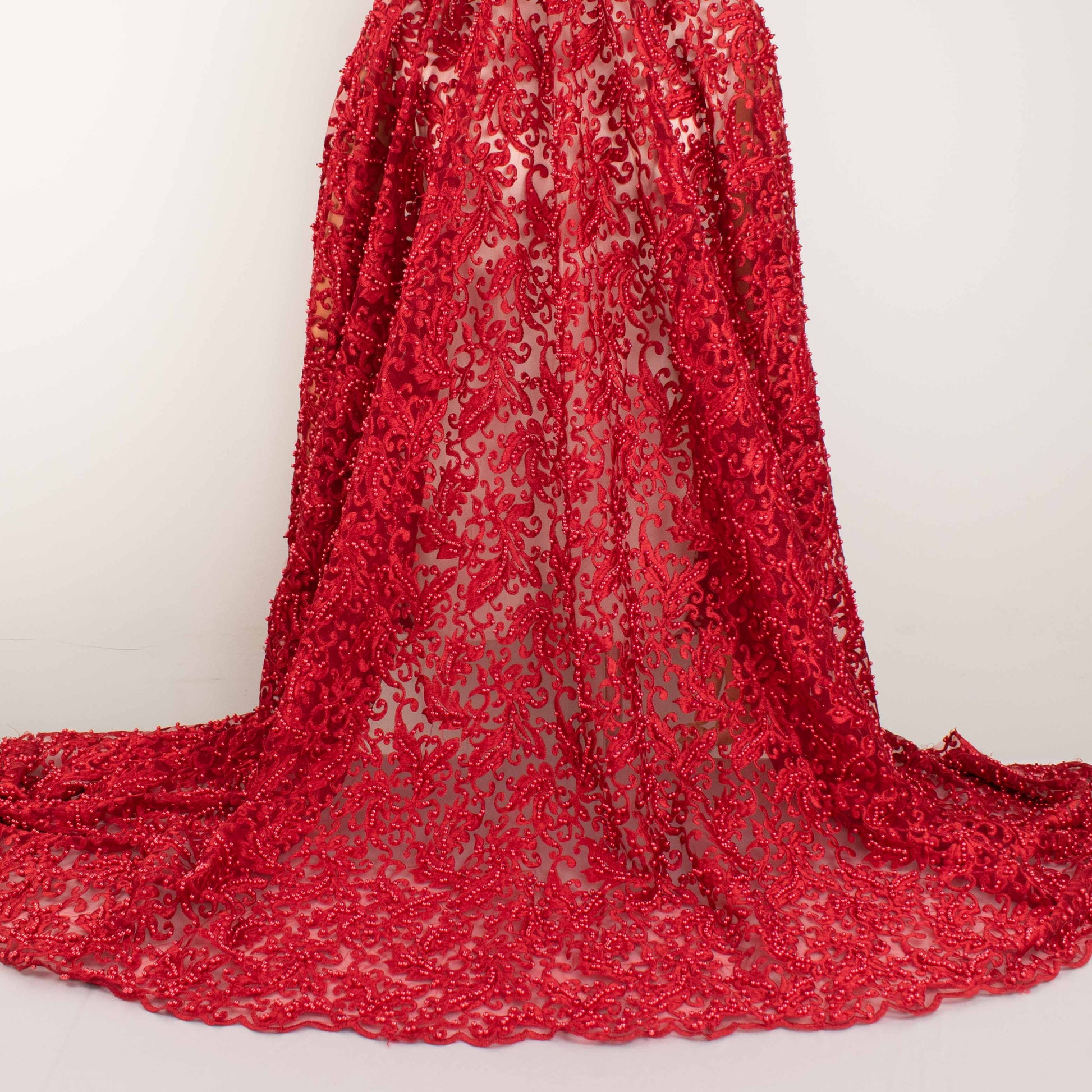 Heavy Embroidered Pearl Beaded Chantilly Lace Red