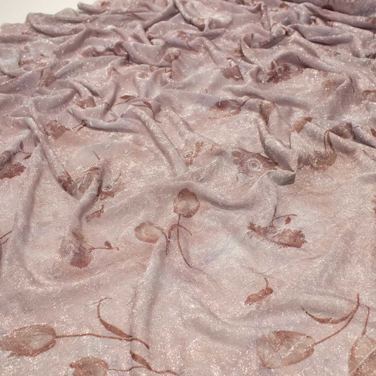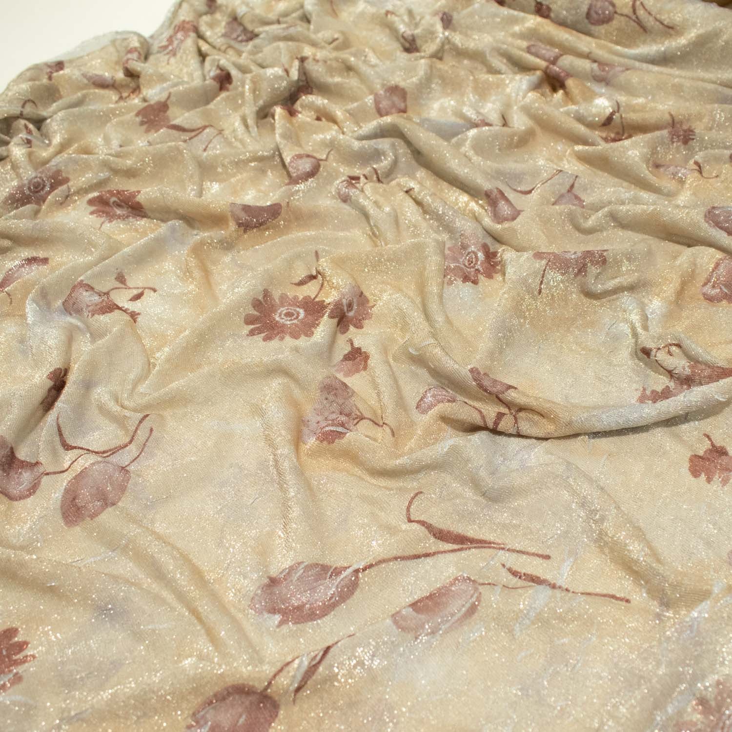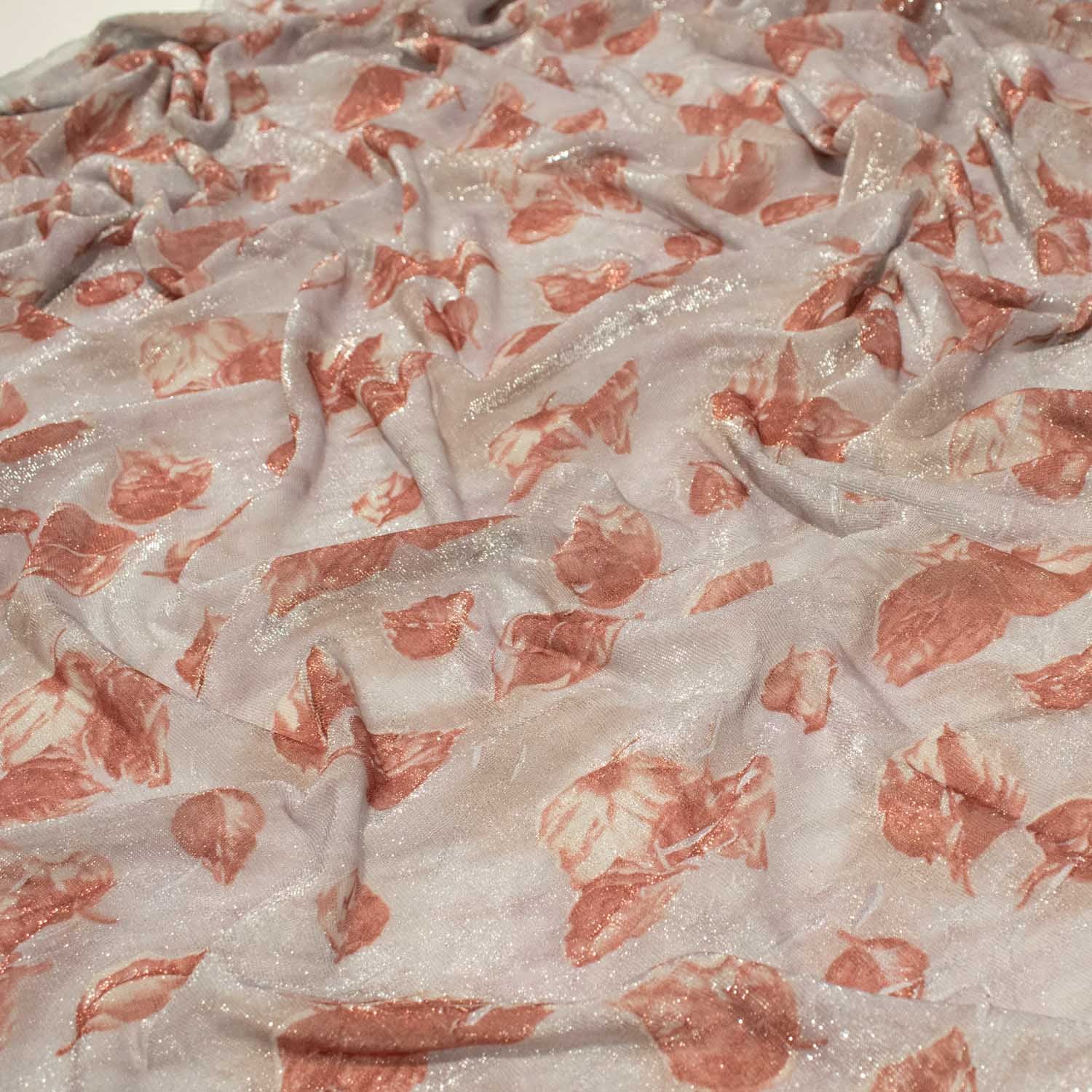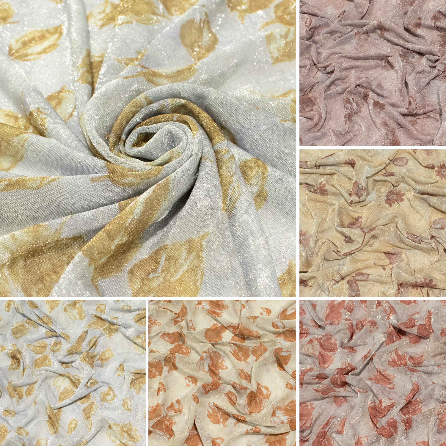 Our Glitter Floral Printed Metallic Knit is a lightweight, slightly see-through fabric with a gentle stretch, making it perfect for fashion tops and other form-fitting garments. The fabric features delicate floral prints with a touch of glitter, adding a subtle sparkle and sheen. Its stretch ensures comfort and flexibility, while its lightweight nature offers breathability, making it ideal for stylish tops, dresses, and tight tops.