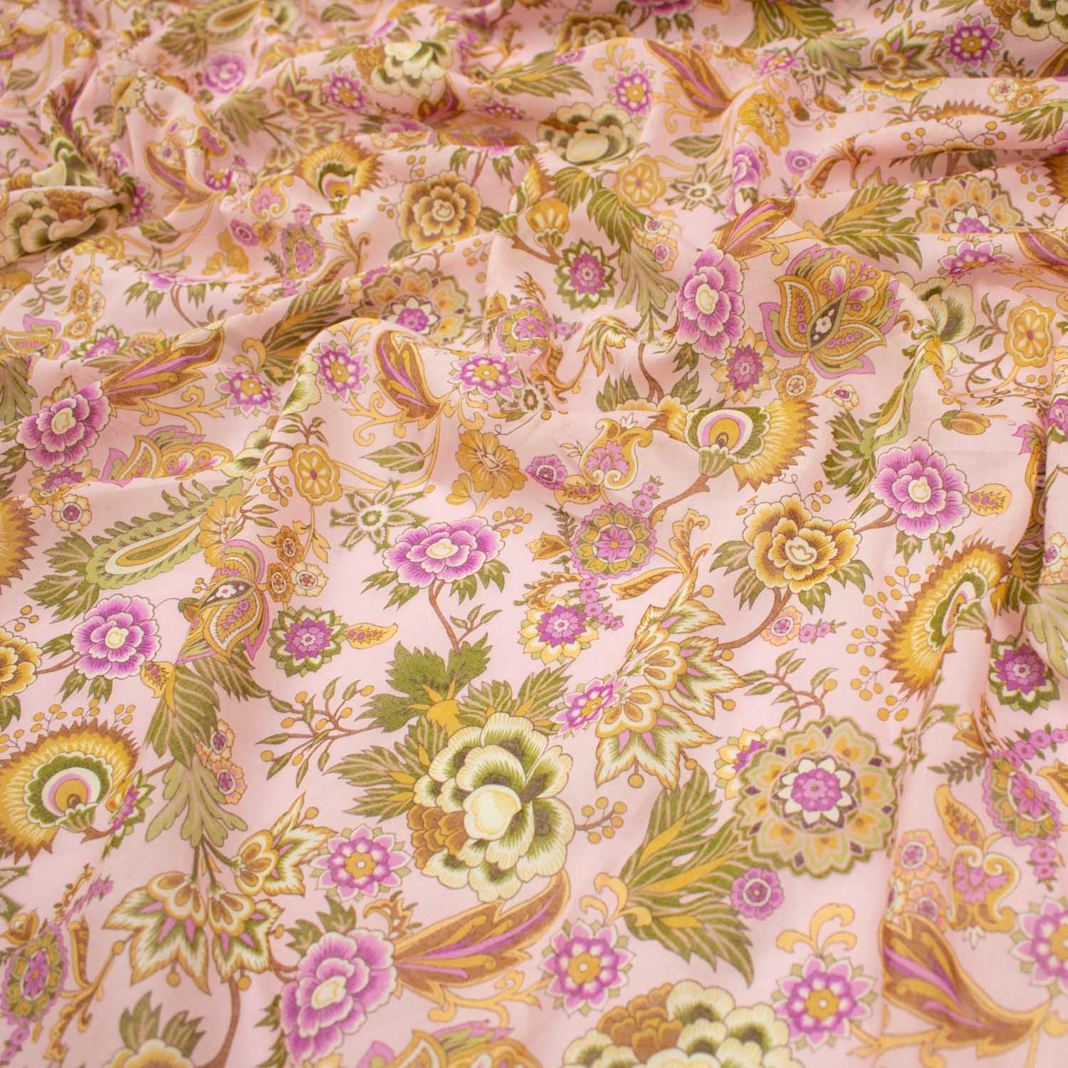 Japanese Pure Cotton Lawn Prints Design-196 Beige Florals & Green Leaves on Baby Pink