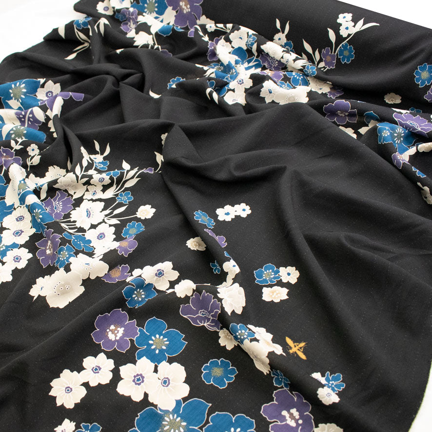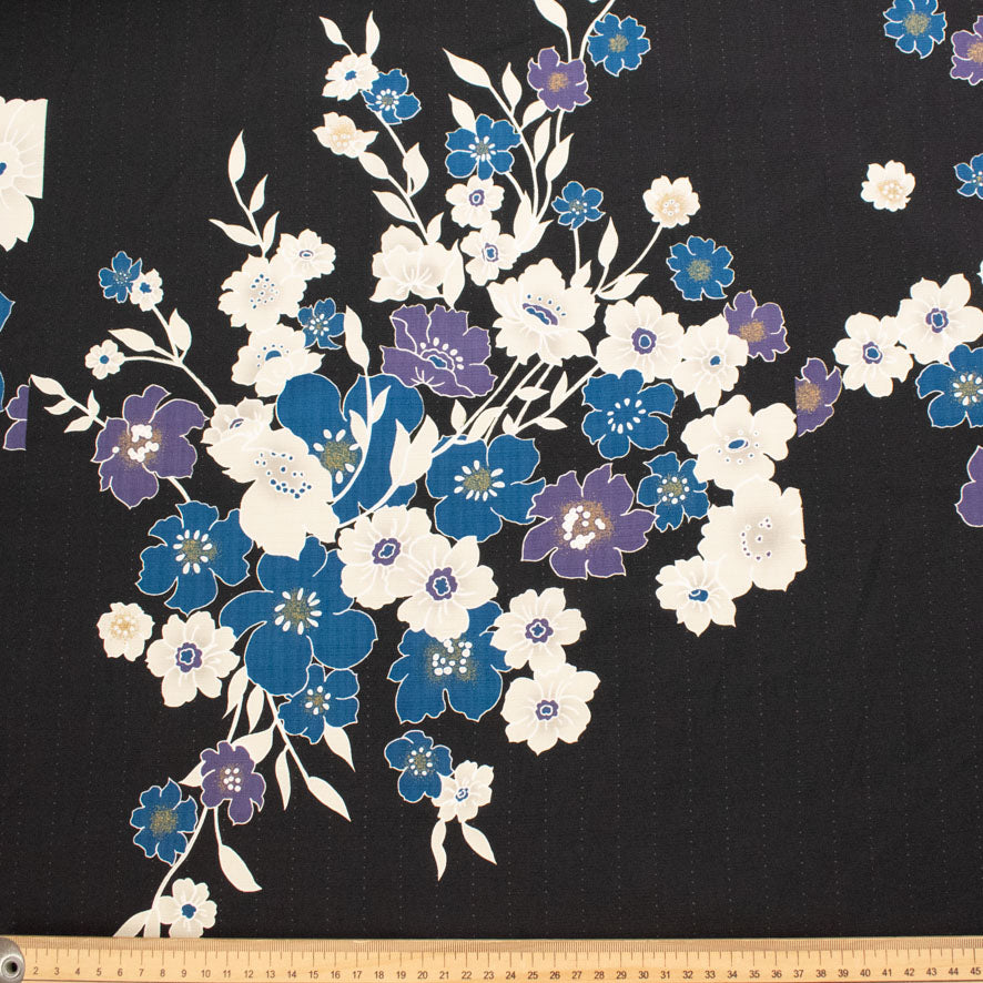 Kimono White & Blue Florals on Black Printed Linen Look Crepe