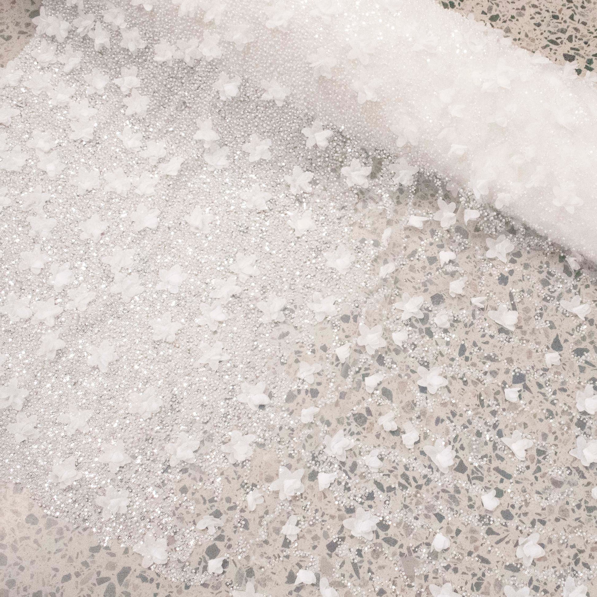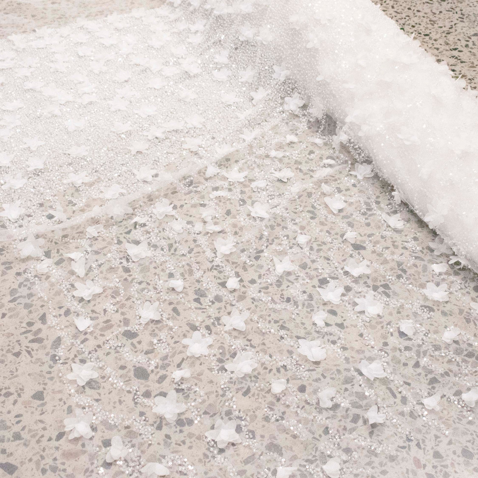 Available in three classic colours – white, pink, and black – and four unique designs, this fabric offers versatility for wedding gowns, red-carpet dresses, veils, skirts, and statement pieces. The soft yet durable 125cm wide mesh base allows for graceful draping and intricate detailing, ensuring a luxurious and polished finish.