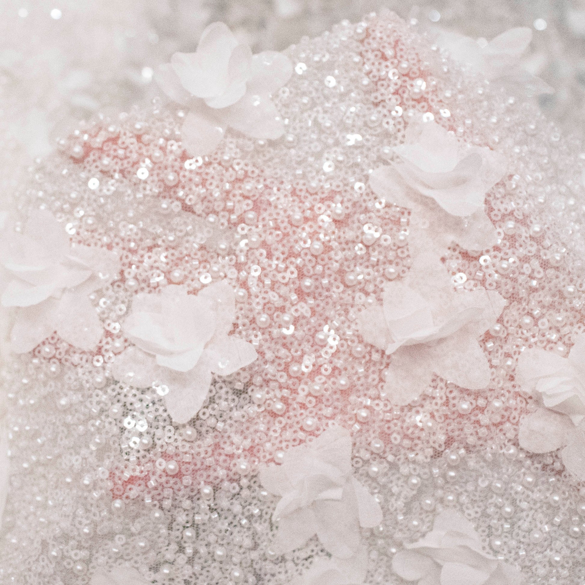 This exquisite mesh lace fabric showcases a striking dual-effect design—one side features densely packed shimmering sequins, pearls, and beads for a luxurious, opulent finish, while the other side transitions into delicate, vine-like embroidery adorned with scattered 3D floral appliqués. This elegant ombre beading effect creates a soft gradient, making it perfect for statement bridal gowns, evening dresses, and couture designs.
