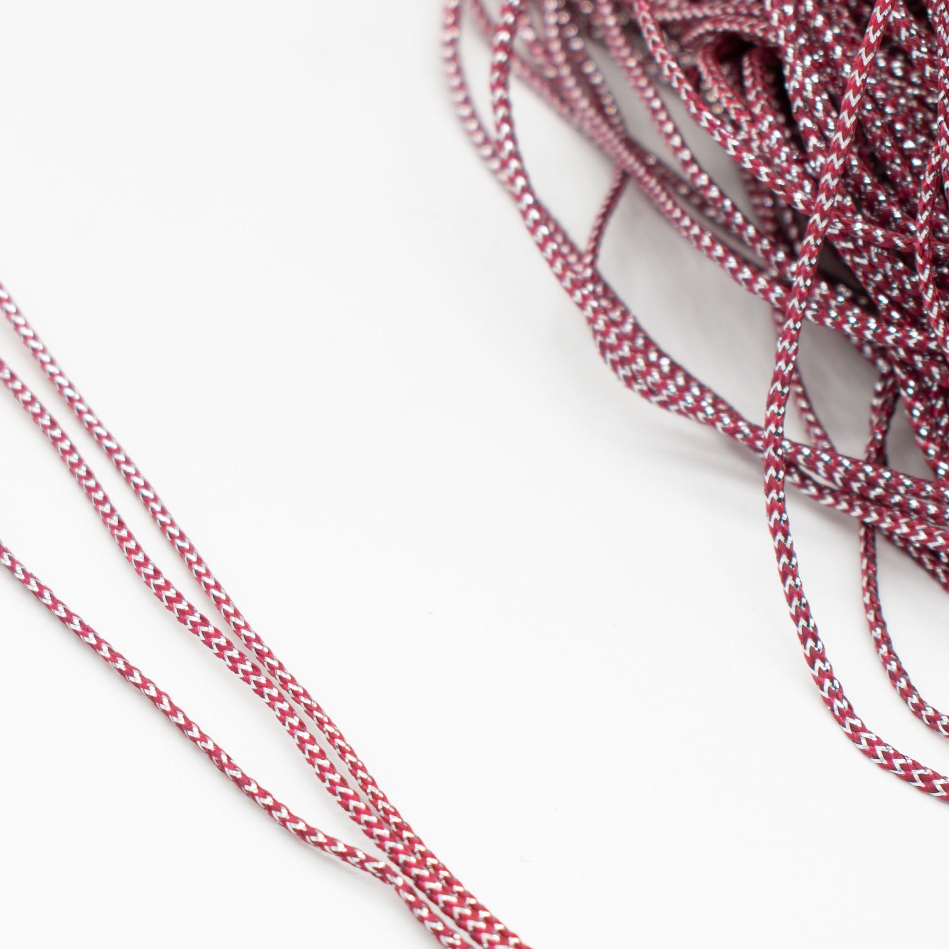 Selection of coloured cords twisted with silver lurex thread for embellishing clothing and craft items. metallic