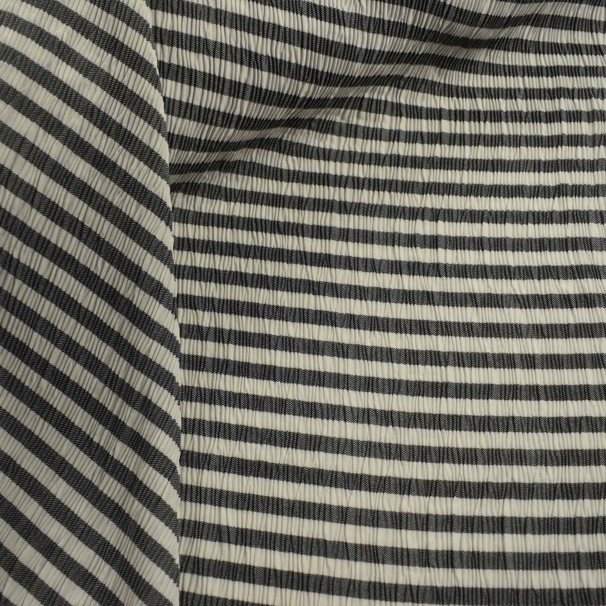 A pleated and gathered stripe poly blended rayon/ polyester print.