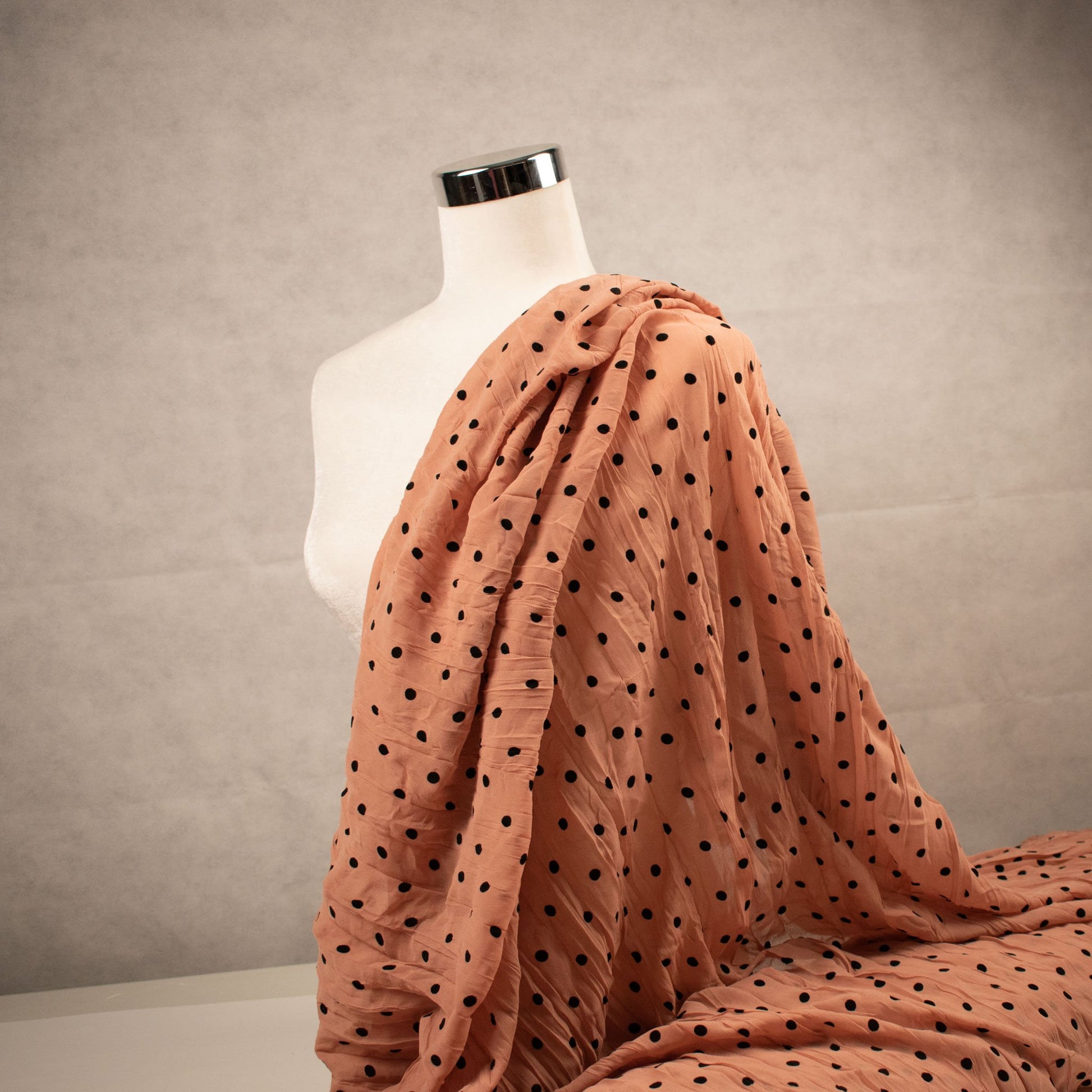 Our Polka Dot Gathered Crepe is a beautiful, slightly sheer, fabric with a delicate gathered or pleated effect. It is perfect for use in dresses, skirts, blouses and more garments. This stylish fashion fabric is great for recreating flowing runway and high fashion garments.