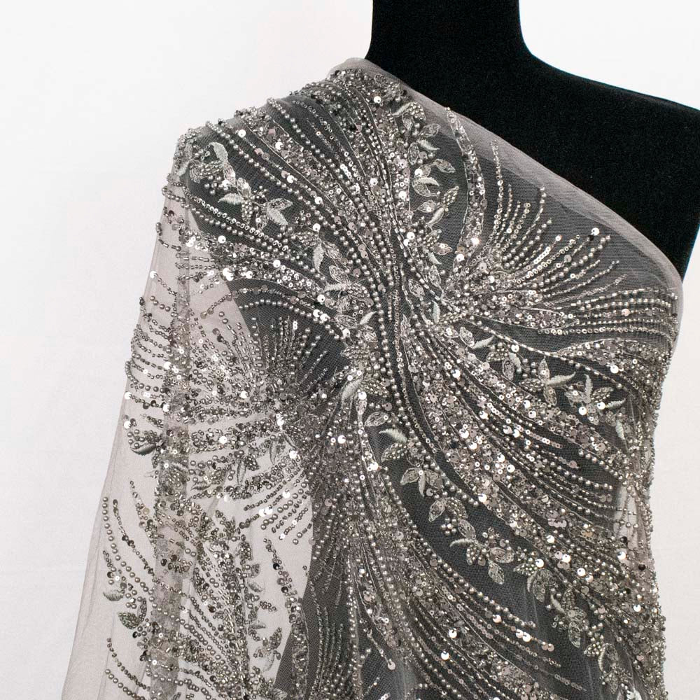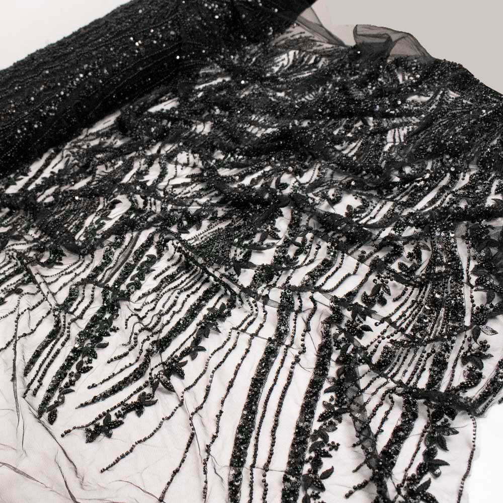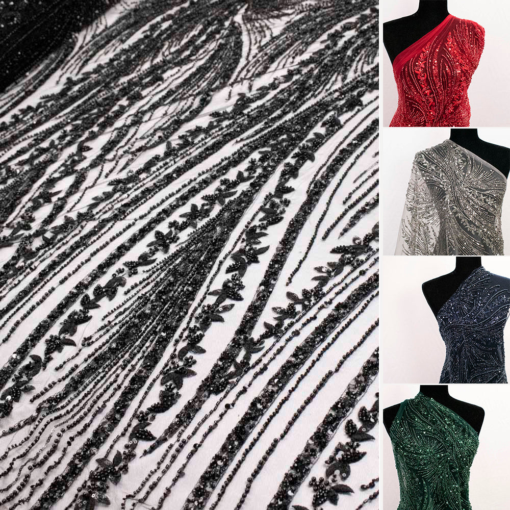 This exquisite lace features intricately embroidered vine trails flowing across the fabric in elegant waves, embellished with shimmering sequins and beads for maximum impact. The surface is rich in texture and sparkle, making it ideal for gowns, eveningwear, stage costumes, and formal outfits. Despite its opulent appearance, the fabric remains soft and manageable to sew.